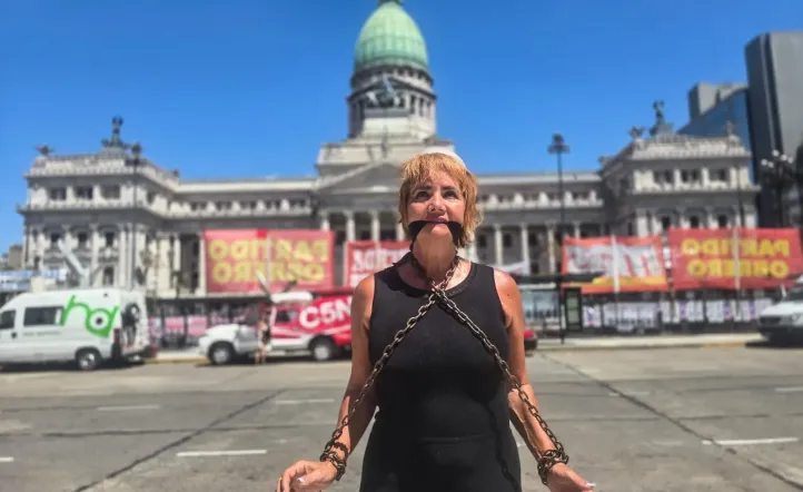 Nancy Pazos se encadenó y amordazó en las puertas del Congreso mientras el Senado trata el proyecto del oficialismo sobre la reforma laboral.