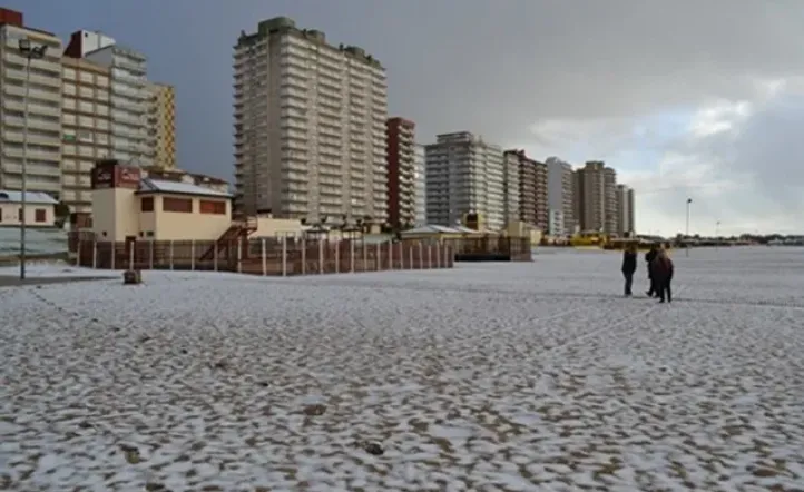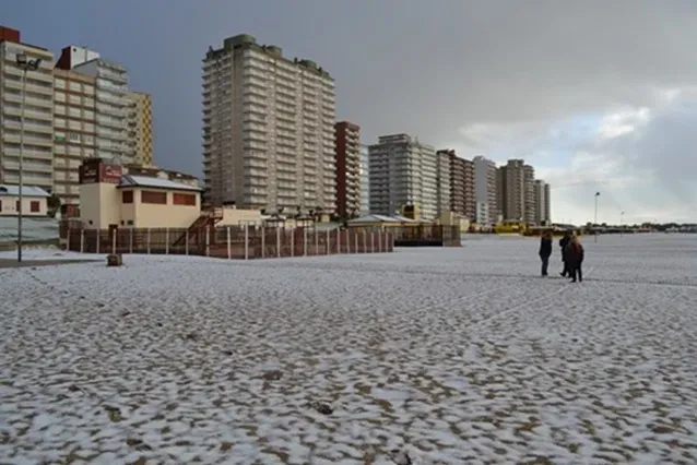 La ciudad de Miramar y sus playas amanecieron pintadas de blanco este lunes, tras una intensa nevada que comenzó a caer durante la tarde del domingo y se intensificó durante la noche y en la madrugada del lunes.