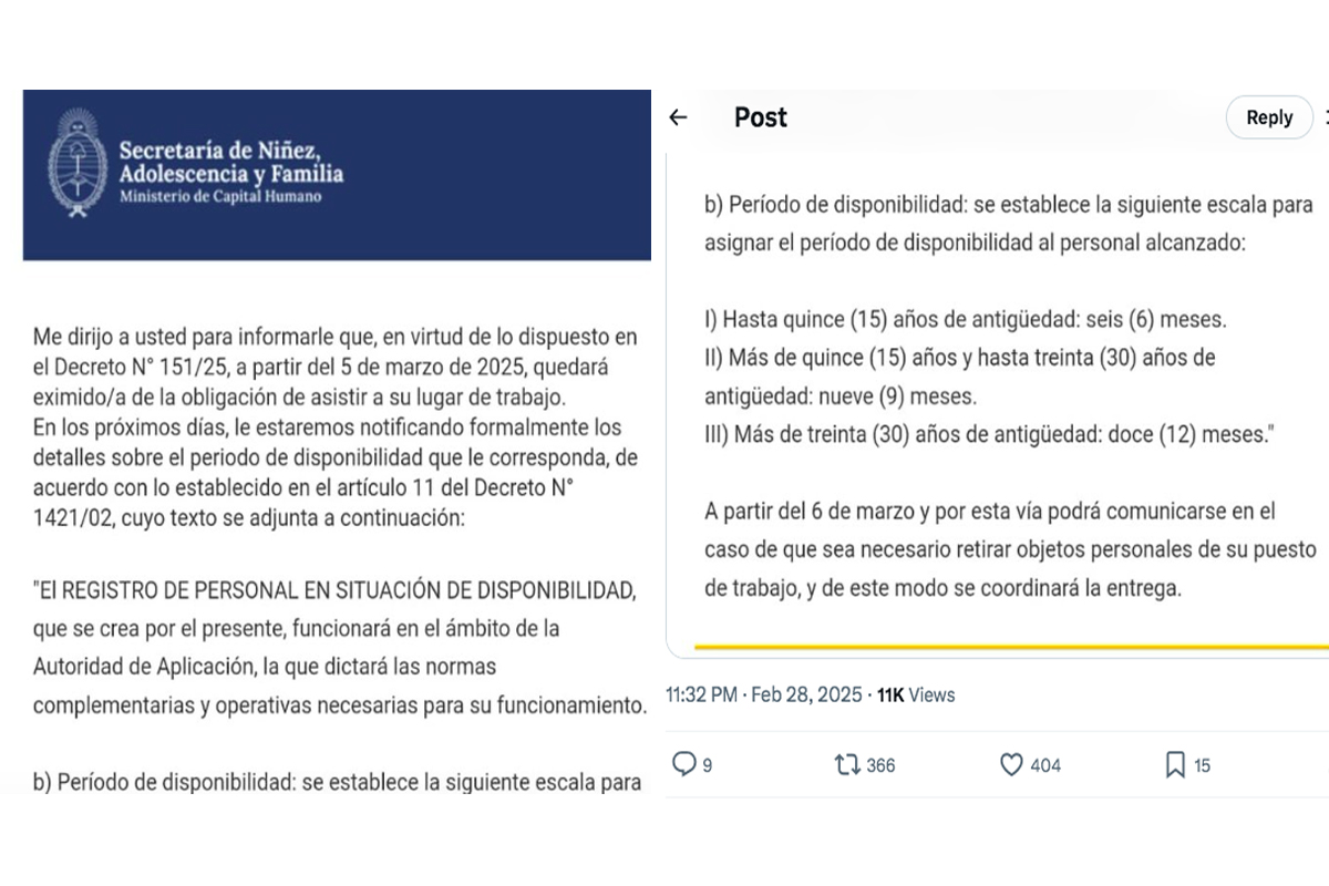 “Me dirijo a usted para informarle que, en virtud de lo dispuesto en el Decreto N° 151/25, a partir del 5 de marzo de 2025, quedará eximido/a de la obligación de asistir a su lugar de trabajo”, rezaba el mensaje, enviado cerca de las 23 horas del viernes. Además, se indicó que en los próximos días los afectados recibirán información sobre el “período de disponibilidad” correspondiente.