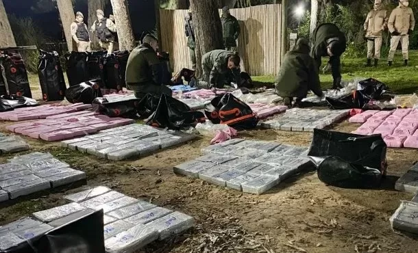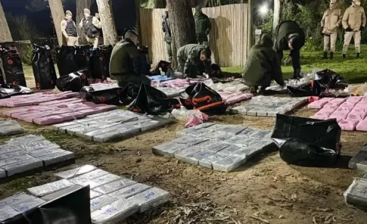 Luego del procedimiento, el juez interviniente ordenó allanamientos en tres domicilios de Escobar. El registro de cabañas y vehículos determinó el hallazgo de 34 “bolsos estancos”, especialmente utilizados para brindar protección total ante agua, polvo y barro. Hallaron en total 800 paquetes sellados con plásticos y envueltos en piñatas rosas. Al control de la prueba de narco-test, arrojó resultado positivo para cocaína, con un peso total de 889 kilos y 255 gramos.