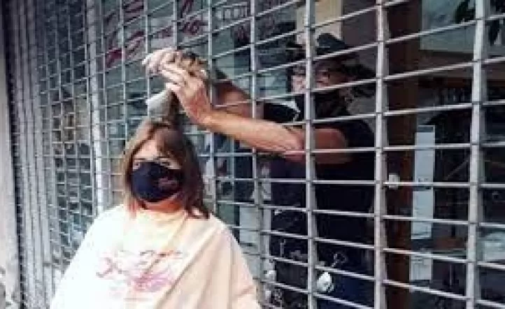 En las horas posteriores al inicio del cierre estricto, una foto se volvió viral. Allí se ve a Emilio, veterano peluquero de Rosario, cortándole el pelo a una joven con una particularidad: una cortina de rejas los separa. “Ahora atendemos como dice ALBERTO. Hacemos TAKE AWAY”, es el texto del posteo de Instagram que rápidamente se hizo viral.