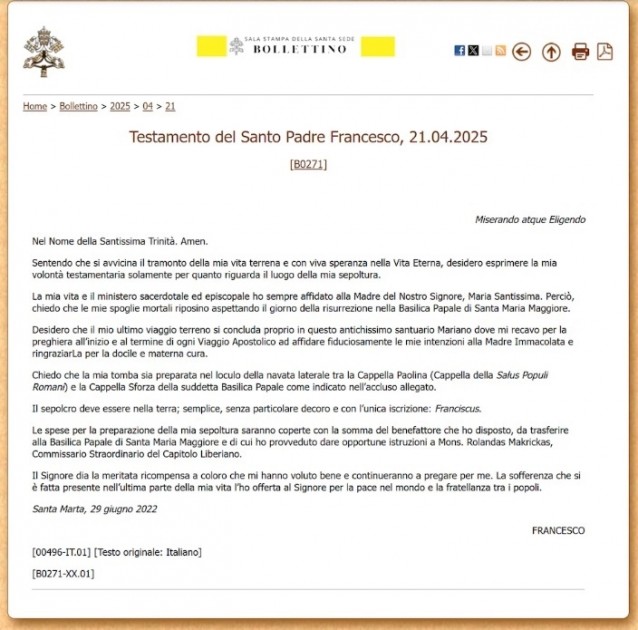 El papa Francisco confirmó en su testamento final -difundido por el Vaticano hace unos momentos- que deseaba ser enterrado en la Basílica de Santa María la Mayor de Roma y “sin decoración particular”.