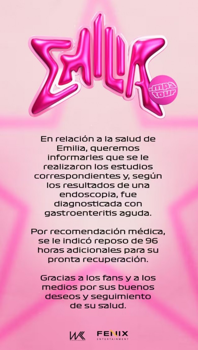 La productora Fénix Entertainment Group emitió un comunicado oficial en el que informa que, por recomendación médica, se le ha indicado un reposo de 96 horas. En el mismo, agradecieron el apoyo y los buenos deseos de los fanáticos y medios de comunicación durante este difícil momento de la cantante.