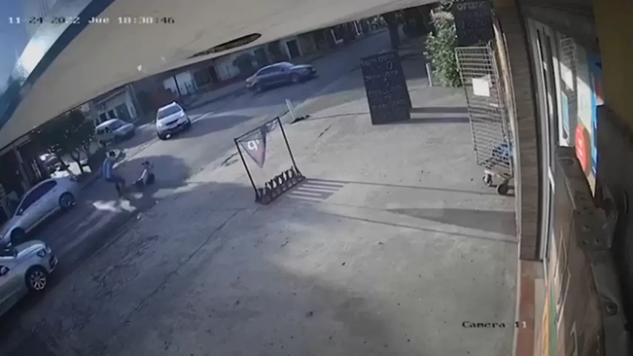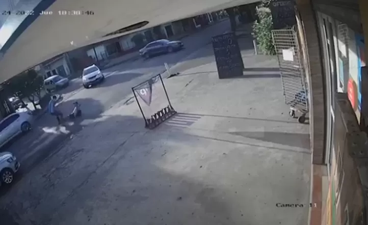 Momentos después, los mismos delincuentes asaltaron a un hombre. En un video captado por una cámara de vigilancia, quedó registrado el momento en el que uno de los ladrones se bajó del auto robado y apuntó con una arma al joven que iba por la calle, quien cayó al suelo al intentar alejarse.