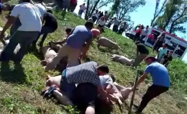 En una de las imágenes que transcendieron, incluso se ve a jóvenes faenando a los animales en plena vera de la ruta, a otros aparentemente muertos, tirados al costado del acoplado del camión jaula que había volcado, y a uno de estos chanchos ya atado al techo de un auto.