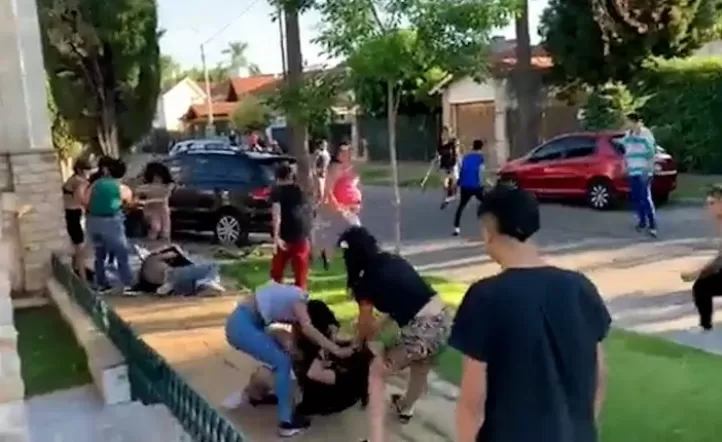 Las imágenes hablan por sí solas: a plena luz del día, jóvenes y adultos se propinan trompadas, patadas y se agarran de los pelos sin ningún tipo de reparo. “¡Ya fue, ya fue!”, se escucha decir a una de las mujeres que trataban de intervenir para detener el caos en la vía pública.