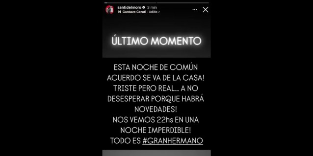 “Último momento. Esta noche, de común acuerdo, se va de la casa. Triste pero real. A no desesperar que habrá novedades. Nos vemos en una noche imperdible, todo es Gran Hermano”, escribió el conductor del ciclo que se emite por la pantalla de Telefe en una historia desde su cuenta de Instagram.