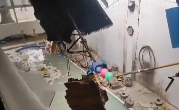Fuentes policiales indicaron a Infobae que el derrumbe se produjo cuando el personal de la obra se encontraba realizando el llenado de una losa y, en determinado momento, se desprendió parte de la medianera -de aproximadamente 10 metros de largo por 1,20 de alto- que da al natatorio. En las imágenes se puede observar la mampostería y chapas dentro de la pileta.