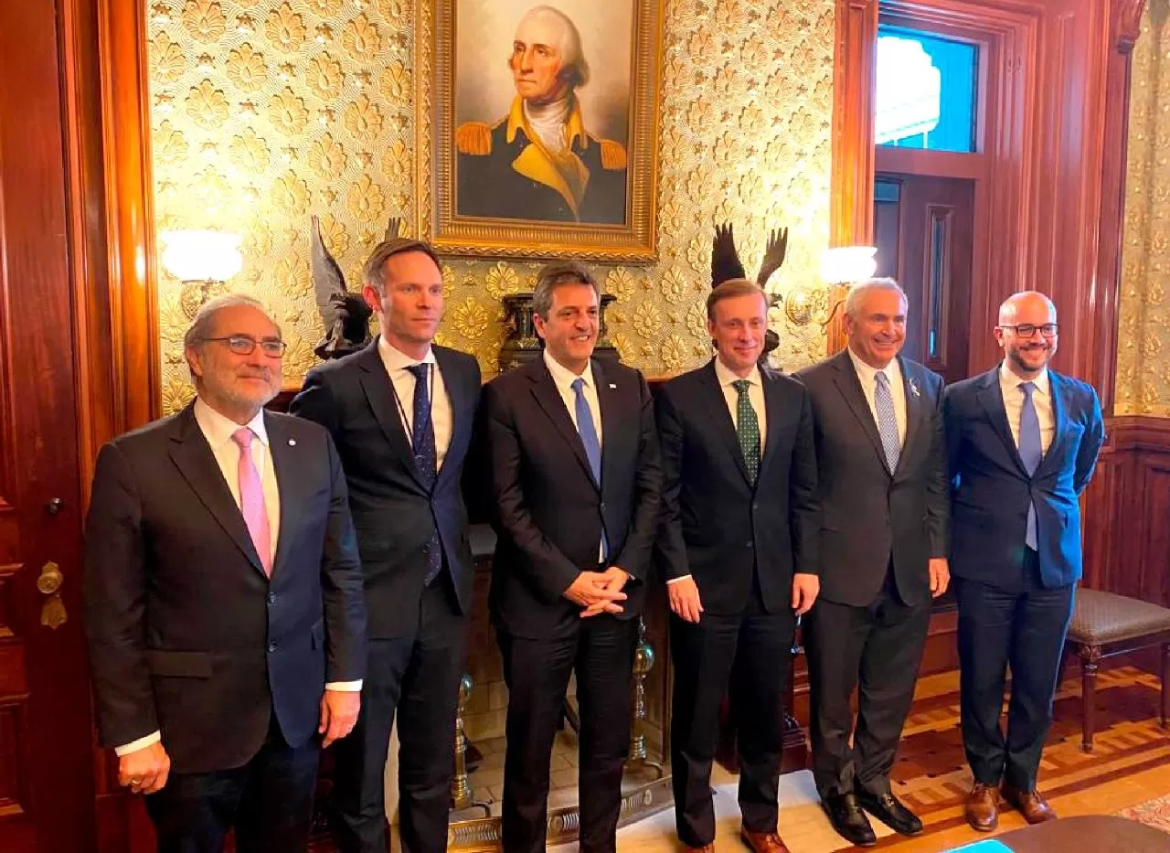 Este miércoles se realizó un encuentró de trabajo en la Casa Blanca entre Sergio Massa con los consejeros del presidente Joe Biden, Jake Sullivan, Mike Pyle y Juan González. También participaron Gabriel Rubinstein, Leonardo Madcur y Gustavo Martinez Pandiani, y los embajadores Jorge Arguello y Marc Stanley.