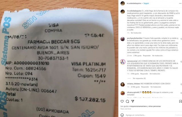 La mujer le sacó una foto al ticket de la farmacia y escribió un duro descargo. “Sr. Milei, llego de la farmacia de comprar mis medicamentos postrasplante... y con descuento de PAMI, que usted lo bajó, ¡pagué esto!”, expresó junto a la imagen del recibo que indicaba que había gastado $107.282,15.
