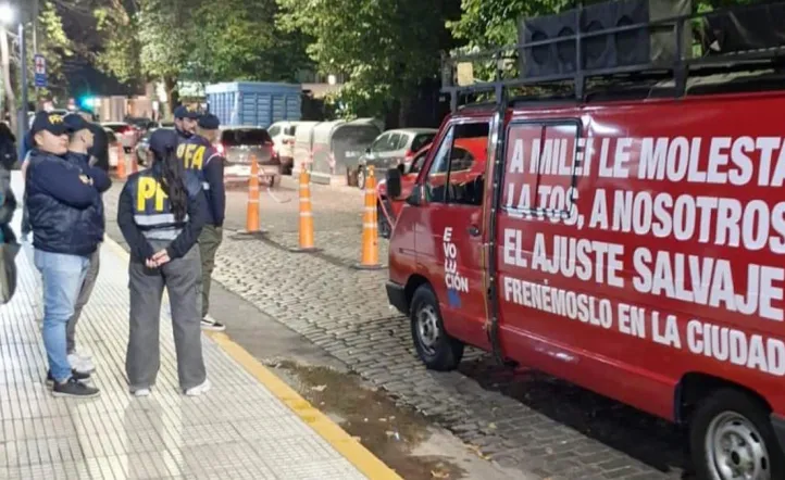 “A Milei le molesta la tos, a nosotros el ajuste salvaje. Frenémoslo en la Ciudad”, es la frase que termina de decorar la camioneta roja que fue noticia por la irrupción de la Unidad Antiterrorista, que pidió revisarla, mientras retenía los DNI a los militantes que iban en el vehículo y los demoraron varias horas.