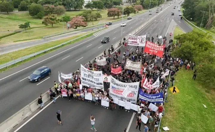 Frente a ellos, la Gendarmería Nacional instaló una férrea barrera de agentes pertrechados con escudos, cascos y su uniforme antidisturbios para impedir que avancen más allá del sitio elegido para la protesta.