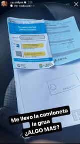 En ese momento, Coco dejó registrado el mal trago con una foto de la nota en la que se le avisaba que le habían levantado una multa y que se habían llevado su camioneta. “Tu vehículo fue infraccionado” rezaba el papel en la parte superior, junto al número de acta que le habían labrado. Sobre la imagen, el actor escribió sin filtro: “Me llevó la camioneta la grúa. ¿Algo más?”.