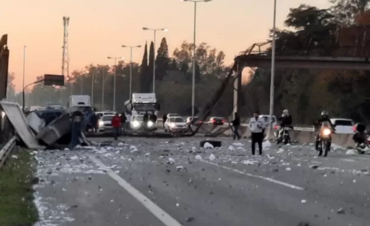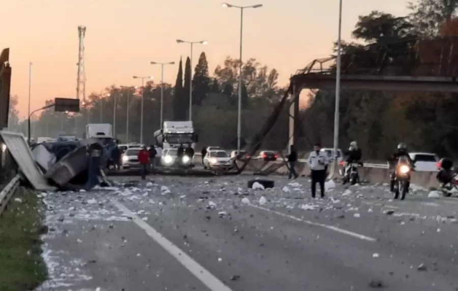 Un camión chocó y derribó un puente peatonal en la Autopista Panamericana este lunes por la mañana a la altura del kilómetro 60 de la ruta 8 sobre el ramal de Pilar. El camionero y el conductor de otro auto sufrieron heridas leves.