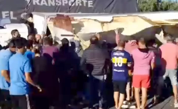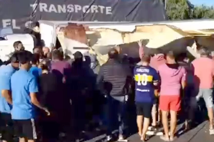 Pasadas las 8 de esta mañana, una treintena de personas comenzó a cruzar la autopista para acercarse hasta el camión aún volcado sobre la acera. Tras romper el techo de lona del acoplado, la gente comenzó a llevarse cajones de plástico con alimentos y cajas con verduras y frutas.