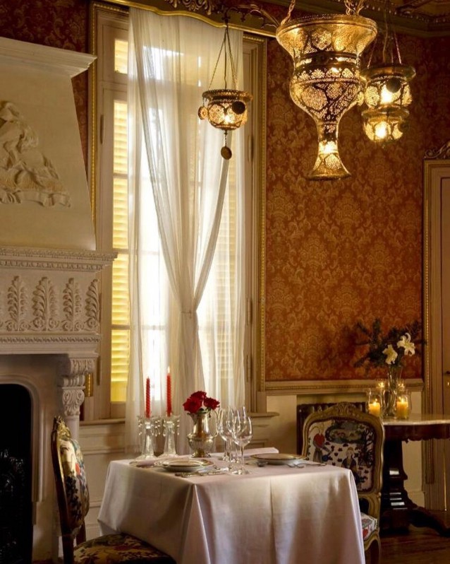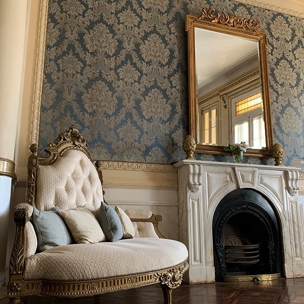 Todo el mobiliario es importado y tiene diferentes estilos como el Francés, Inglés e Imperial. Hay detalles palaciegos pensados para transportarnos al pasado, como una estufa de hierro fundido de origen Belga de 1880, imponentes techos casetonados, paredes con un delicado brocato de seda italiana, un gran gobelino holandés que cubre la pared de la escalera que lleva hasta el primer piso y un vitreaux que permite el ingreso de luz natural.