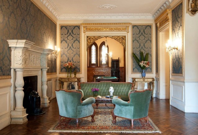 El dorado y azul real son colores predominantes en toda la decoración del castillo, ambos muy utilizados en el siglo XIX para mostrar lujo y opulencia. Cada detalle de la estancia fue pensado para transportarnos al siglo XIX.