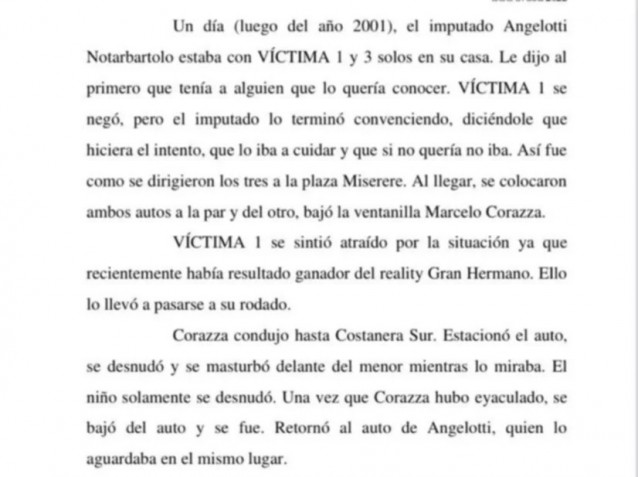 “Corazza se desnudó y masturbó delante del menor mientras lo miraba. El niño solamente se desnudó y, una vez que Corazza eyaculó, se bajó del auto y se fue. Retornó al auto de Angelotti, quien lo aguardaba en el mismo lugar”, detalla parte de la causa que se difundió en las redes de “LAM” (América).