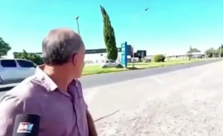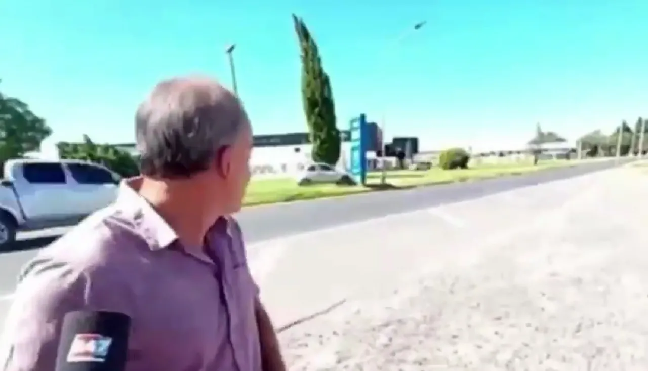 El insólito incidente ocurrió sobre una rotonda en uno de los accesos a Neuquén desde Cipolletti. El momento quedó registrado en medio de una entrevista.