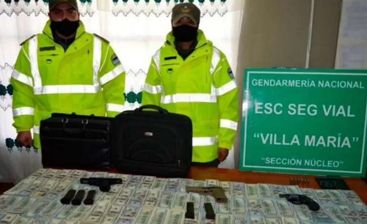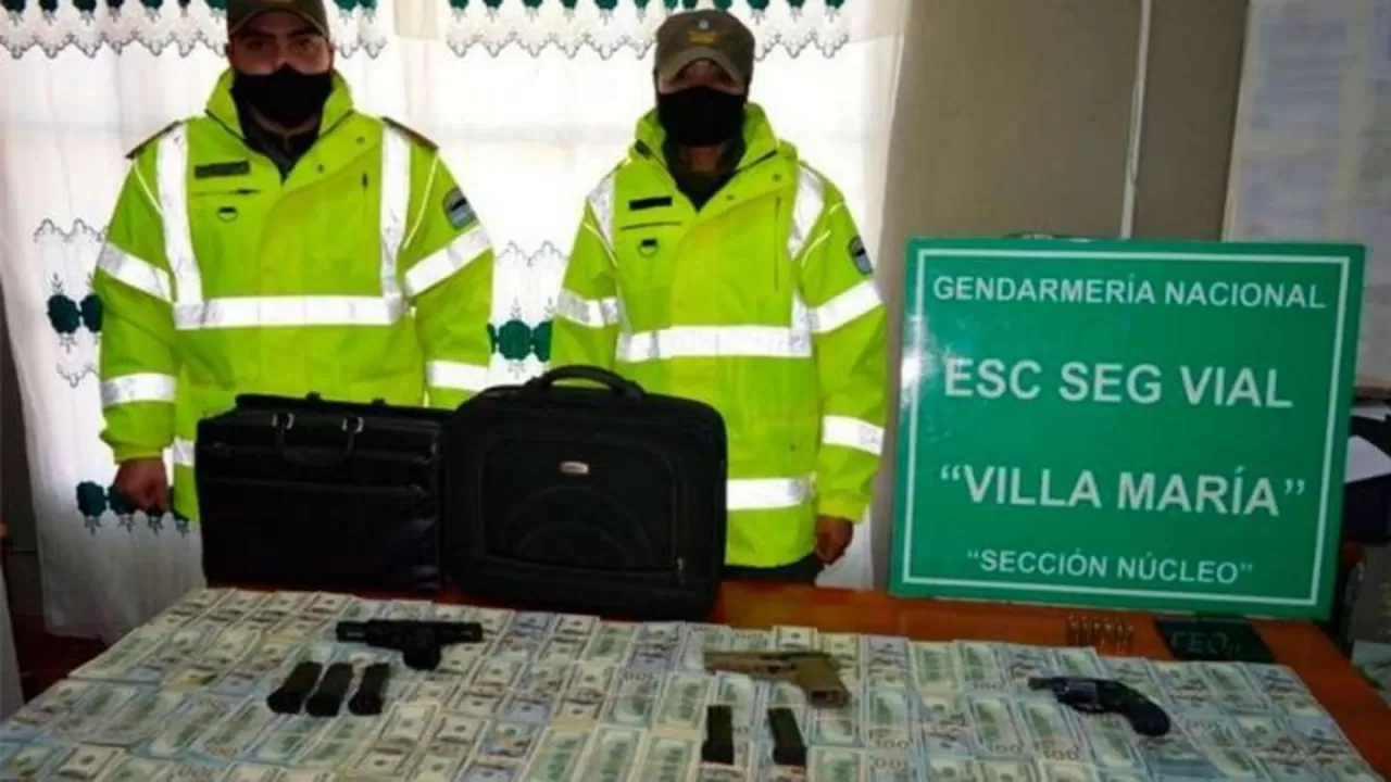 Un hombre y su hijo fueron detenidos por la Gendarmería con un millón de dólares en efectivo en dos maletines, cheques por US$35.415 y armas cuando viajaban en su coche por la autopista Córdoba-Rosario, y ahora están siendo investigados por lavado de dinero.