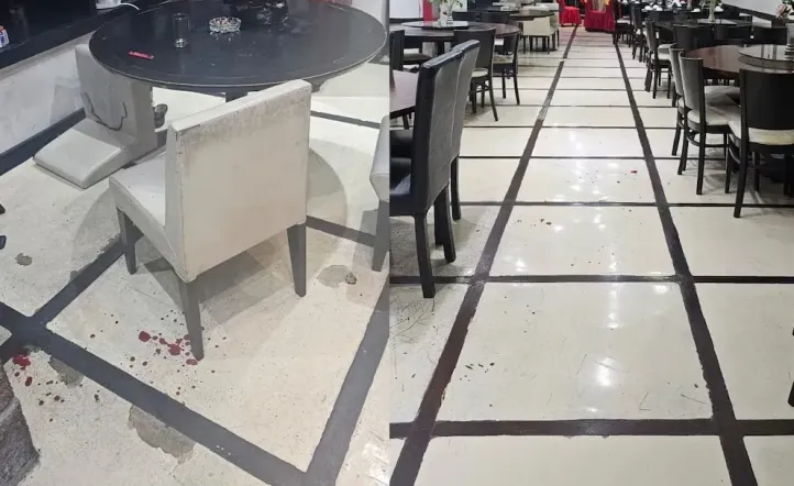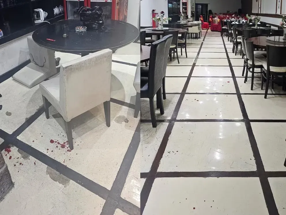 Tal como se puede observar en las imágenes del restaurante de comida china, a las que tuvo acceso este medio, el piso del salón principal quedó con los restos de sangre de la víctima y con el desorden causado por el atacante al darse a la fuga.