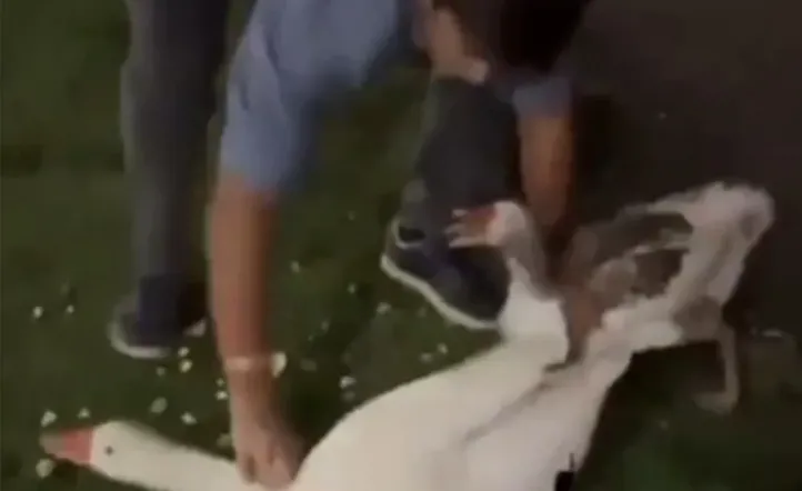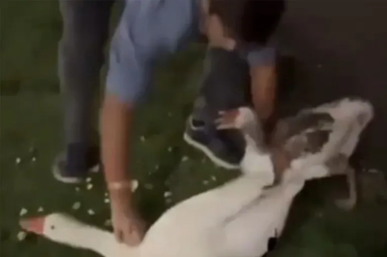 Mientras su cómplice acercaba la imagen a los gansos, el agresor se abalanzó sobre ambos y los tomó del cuello, tratando de inmovilizarlos contra el césped.