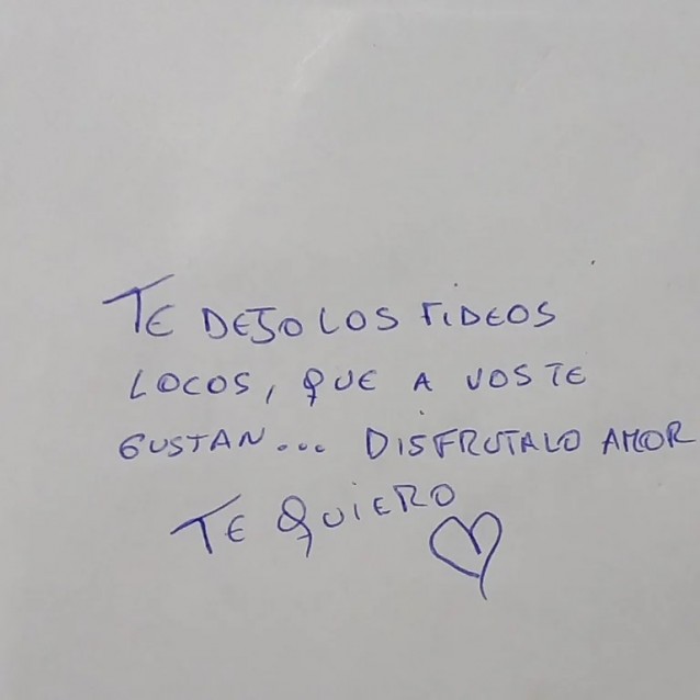 En primer lugar, la mujer no ocultó demasiado la sorpresa que guardaba entre las pastas, ya que el mensaje que le escribió a su hijo rezaba: “Te dejo los fideos locos que a vos te gustan… disfrutalos, amor. Te quiero”, fue el mensaje de la madre.
