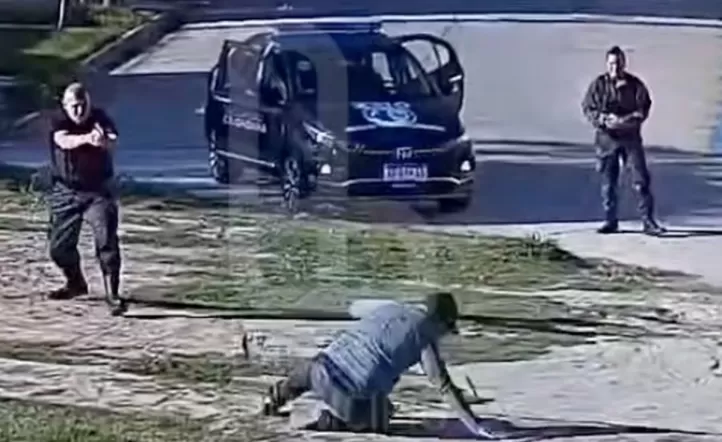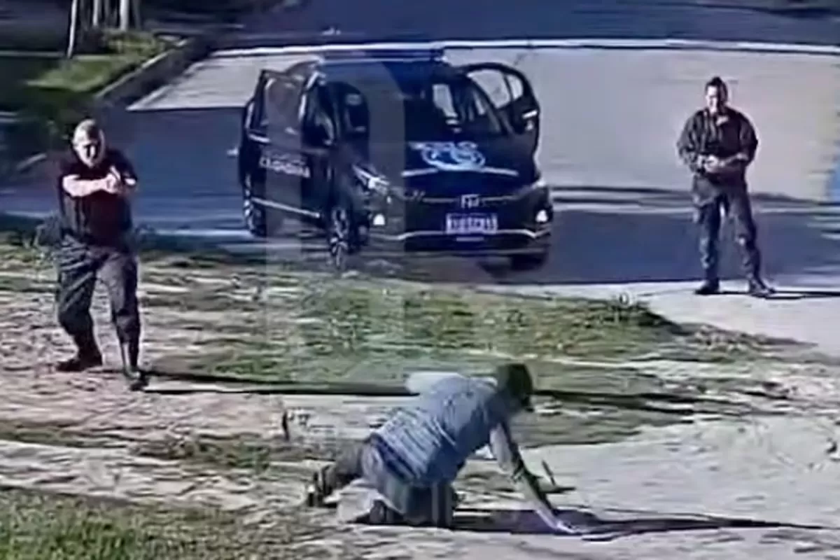 Reiteradamente le pidieron que arroje su cuchillo al piso. Al no hacerlo, uno de los oficiales le apuntó y le disparó con la pistola Byrna, fabricada por Bersa y que dispara municiones de gas pimienta. Fue así que el sujeto cayó y pudieron detenerlo. El momento fue captado por una cámara de seguridad.