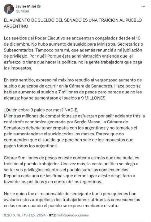 “EL AUMENTO DE SUELDO DEL SENADO ES UNA TRAICIÓN AL PUEBLO ARGENTINO”, encabezó el posteo en X el mandatario.