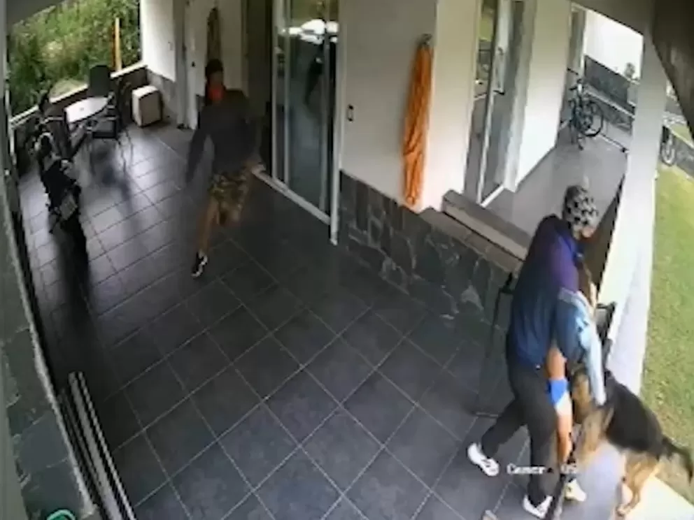 Tras caminar varios metros con el niño a cuestas, el hombre se abalanzó sobre él, lo tiró al pasto y luego de un feroz forcejeo logró que soltara a su hijo; que quedó sentado e inmovilizado en el jardín. En las imágenes también puede observarse el momento en que el perro ovejero alemán de la familia intervino en la pelea para ayudar a su dueño: le ladraba y le tiraba tarascones a los delincuentes, quienes trataban de ahuyentarlo a patadas. A pesar de todo, los delincuentes huyeron a pie una vez perpetrado el robo.