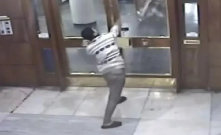 Un delincuente rompió con una piedra el vidrio de la puerta principal del acceso a un edificio, apuñaló al encargado y le robó. Tras ello, escapó y es intensamente buscado.