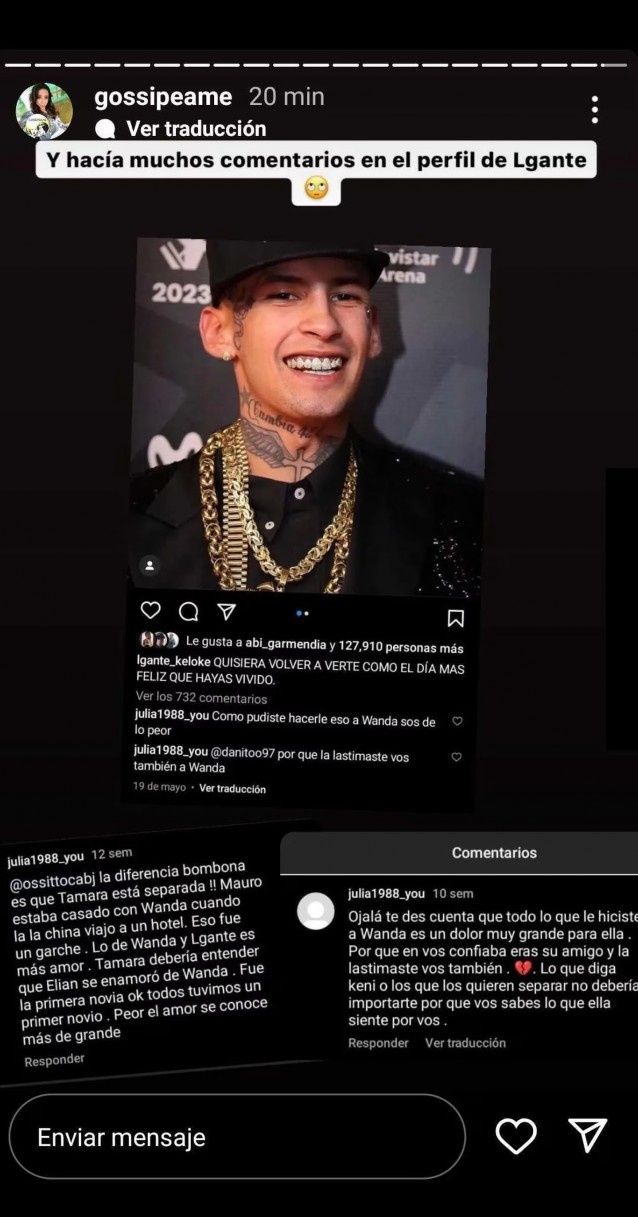 Según reveló, desde la cuenta @julia1988_you Wanda le habría dejado distintos mensajes a L-Gante, quien sigue detenido.