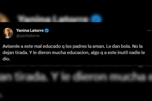 Poco tardó Yanina Latorre en salir a contestarle. Por el mismo medio, expresó tajante: “Avísenle a este mal educado que los padres la aman. Le dan bola. No la dejan tirada. Y le dieron mucha educación, algo que a este inútil nadie le dio”.