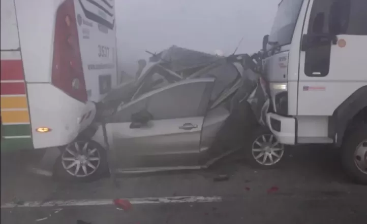 En las imágenes compartidas por los medios locales, se puede ver a un auto aplastado entre un micro y un camión, mientras que el colectivo también se encuentra impactado sobre la parte trasera de un transporte de carga.